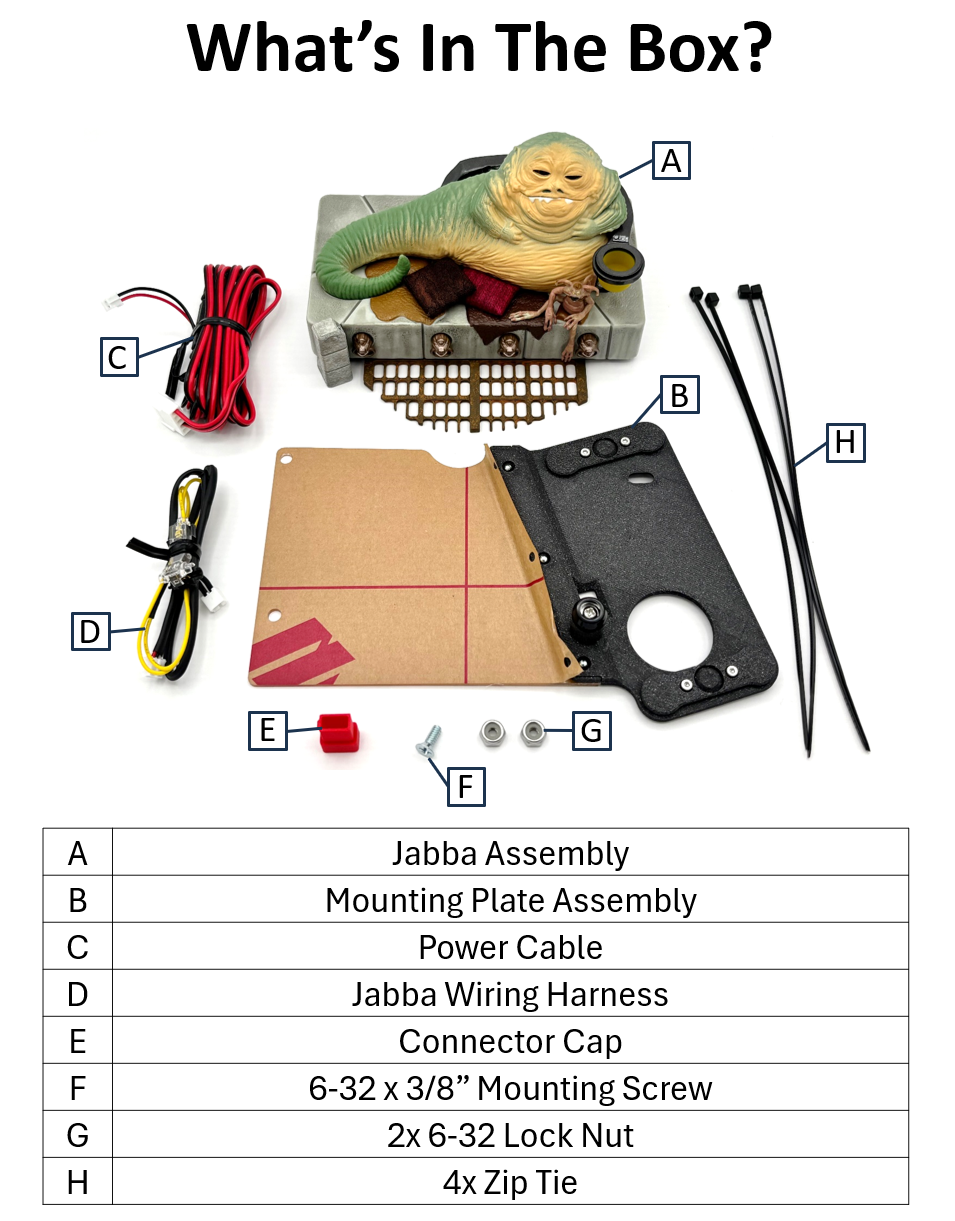 Note: Jabba’s mouth movement is not synchronized with in-game audio. Due to limitations in accessing Stern’s internal audio triggers, the mod is activated via the ramp shot opto sensor rather than audio cues.