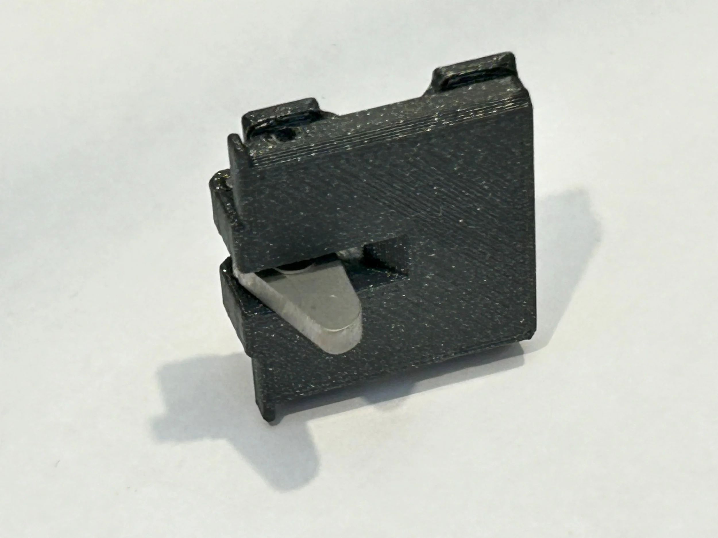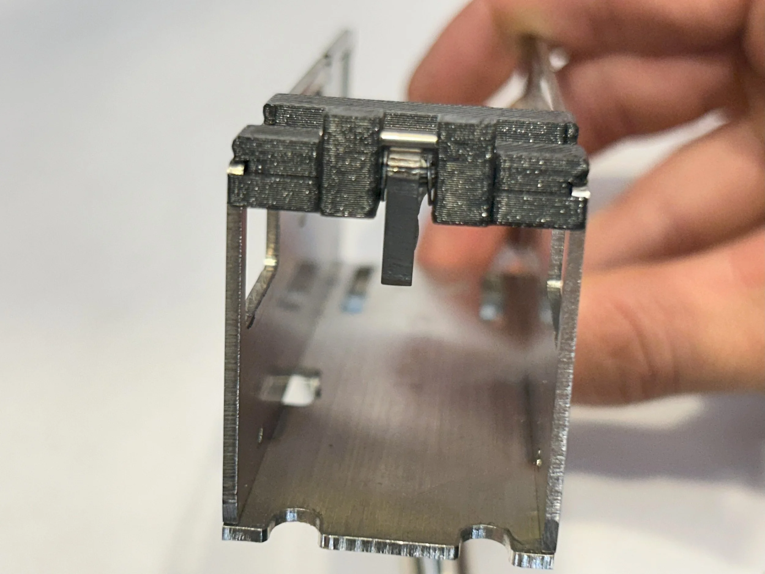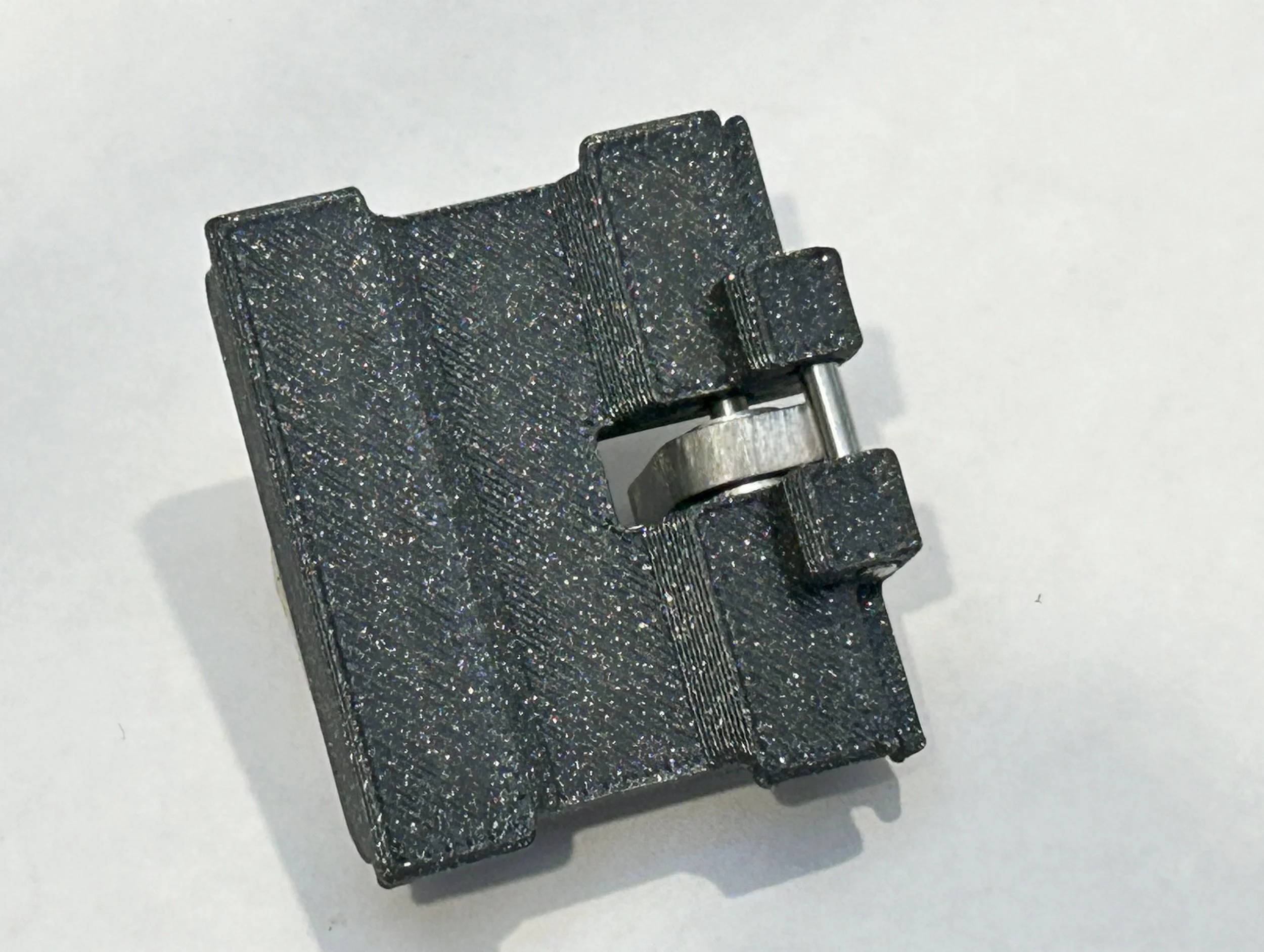 The body of the mod is 3D printed. The pivoting arm is laser-cut from 316 stainless steel. The pivot pin, stop pin, and washers are also stainless steel.